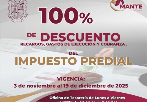 Cd. Mante, Tamaulipas.- El Gobierno Municipal de El Mante, que encabeza la Presidenta Patty Chío, informa a la ciudadanía que a partir de este lunes inicia el programa de descuento del 100% en recargos, gastos de ejecución y cobranza en el pago del impuesto predial. Este beneficio, fue aprobado por el cabildo y estará vigente […]